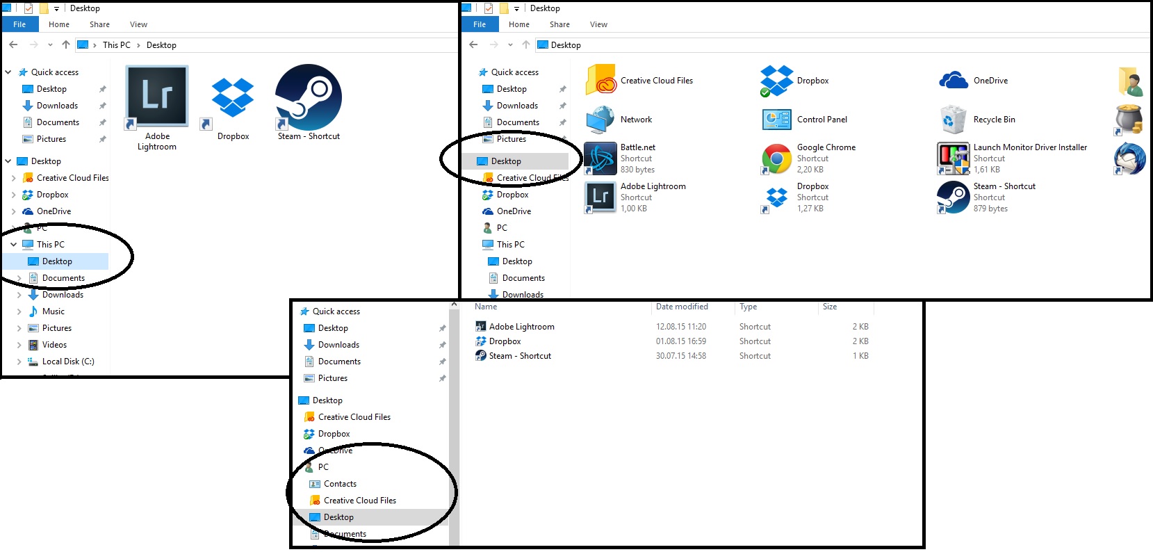 Ich verstehe nicht so recht wieso in den Situationen "This PC --> Desktop" und "PC Name --> Desktop" nur ein Teil der Icons angezeigt wird (Das gleiche gilt übrigens für den Quick Access, aber den hab ich in der Paint-Arbeit mal außen vor gelassen)