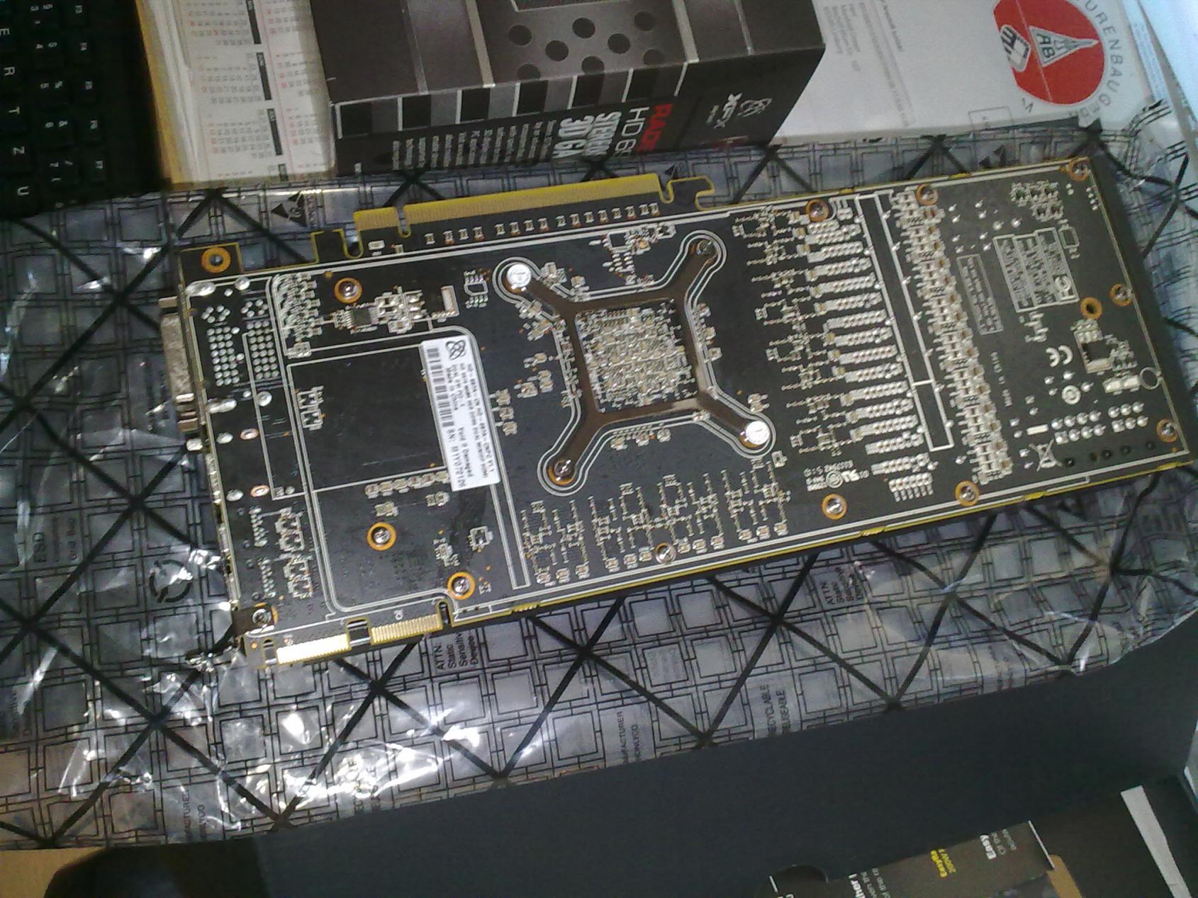 Guten Tag, ich habe mir die Radeon HD 6970 gekauft und eingebaut, doch der PC startet nicht. Laut den BIOS Warntönen ist die Grafikkarte defekt (1x langer, 2x kurze Warntöne in der Dauerschleife). Beim genaueren Hinsehen fiel mir auf dass die Rückseite der Grafikkarte verunreinigt ist und beim Vergleich mit Bildern derselben Karte im Internet stellte sich heraus, dass bei mir die Plastikverkleidung der Rückseite komplett fehlt.