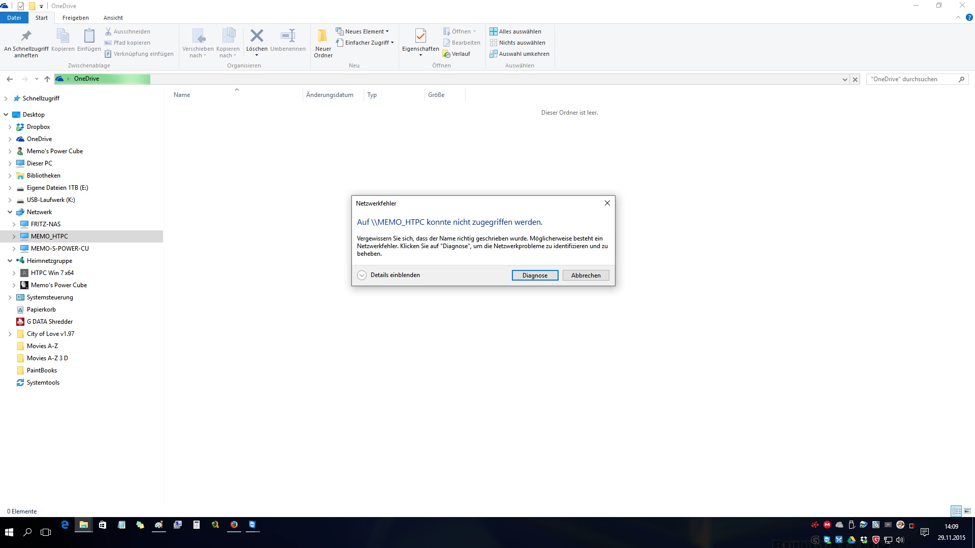 Auf meinen Hauptrechner erscheint der HTPC auf dem Arbeitsplatz im Netzwerk und in der Heimnetzgruppe; Ich kann nun wieder hier zumindest einen Teil der freigegebenen Ordner vom HTPC sehen, jedoch nicht darauf zugreifen (siehe Fehlermeldung).