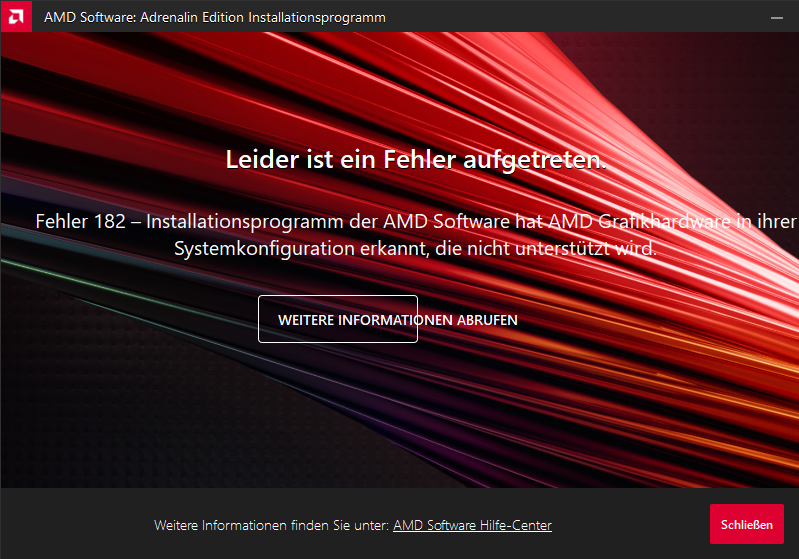 Vor wenigen Minuten ist hier ein neuer Treiber 23.9.2 für AMD-Grafikkarten im Downloadbereich aufgelistet worden. Weil man sein System ja gern aktuell hält wollte ich den selbstverständlich gleich ausprobieren und erhielt folgende Fehlermeldung: "Fehler 182 - Installationsprogramm der AMD Software hat AMD Grafikhardware in ihrer Systemkonfiguration erkannt, die nicht unterstützt wird."