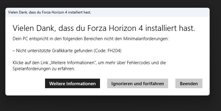 Laut Berichten hier im Forum kannst du doch die Fehlermeldung ignorieren und wegklicken verstehe nicht wo jetzt dein Problem ist.DJMadMax schrieb:Alter Verwalter, wenn Forza Horizon 3 nicht wieder lauffähig gemacht wird, dann flippe ich aber aus!