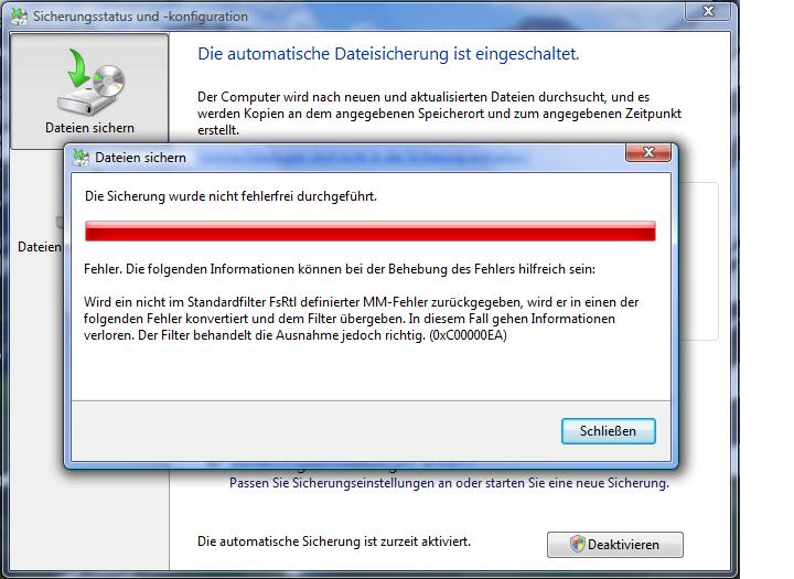 Die Dateisicherung ist fehlgeschlagen. Fehler: Wird ein nicht im Standardfilter FsRtl definierter MM-Fehler zurückgegeben, wird er in einen der folgenden Fehler konvertiert und dem Filter übergeben. In diesem Fall gehen Informationen verloren. Der Filter behandelt die Ausnahme jedoch richtig. (0xC00000EA)
