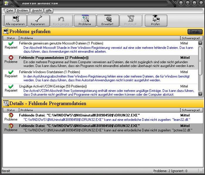Zusätzlich zeigt Norton WinDoctor bei der Überprüfung 2 Fehler an, die er auch nicht reparieren kann. (siehe Screen)