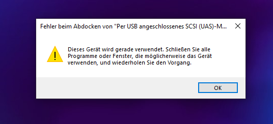 Ich gehe auf das Laufwerk z.B /g: und wähle es an zum Abdocken an und dabei kommt dann diese Fehlermeldung die mir keine weitere Optionen offen lässt. ... Ich will es nur versuchen zu verstehen wie und warum. Ausserdem kenne ich gerade keinen anderen Weg womit ich bei solchen Probleme das Laufwerk noch ordnungsgemäß abgedockt bekomme.