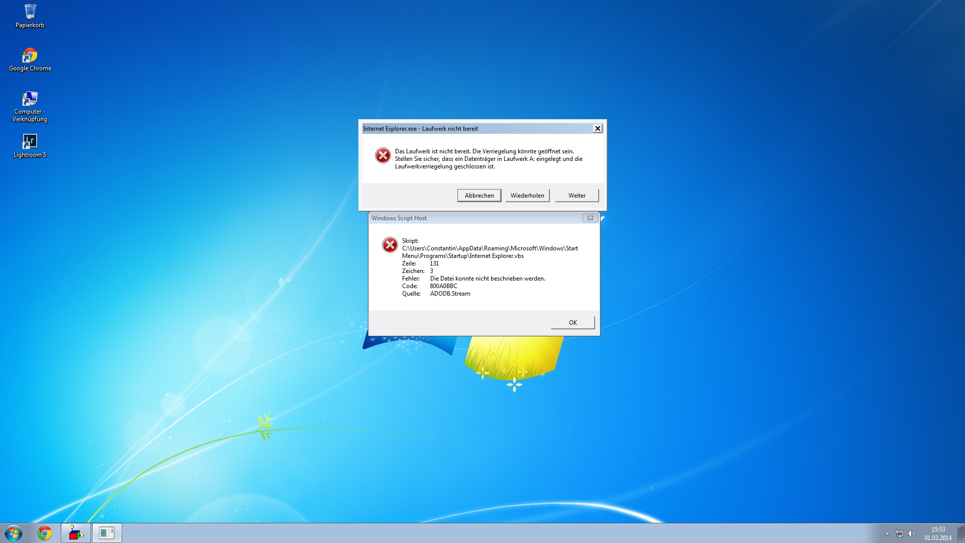 Bitte um Hilfe. Hab meinen Pc schon ein paar mal neu aufgesetzt und immer wieder tritt folgender Fehler auf. weiß einfach nicht wie ich den weg bekomme. ich schicke euch ein Foto. das einzige was ich gemacht habe: ati catalyst, chrome und adobe lightroom5
