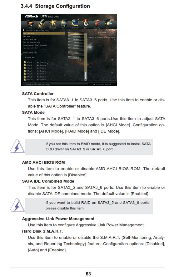 Im UEFI unter Advanced - Storage Configuration und dort 'SATA Controller' auf 'Enabled' setzen, falls noch nicht geschehen und den nachfolgenden Eintrag 'SATA Mode' auf 'AHCI Mode' setzen, falls noch nicht geschehen. Siehe auch Handbuch Seite 63