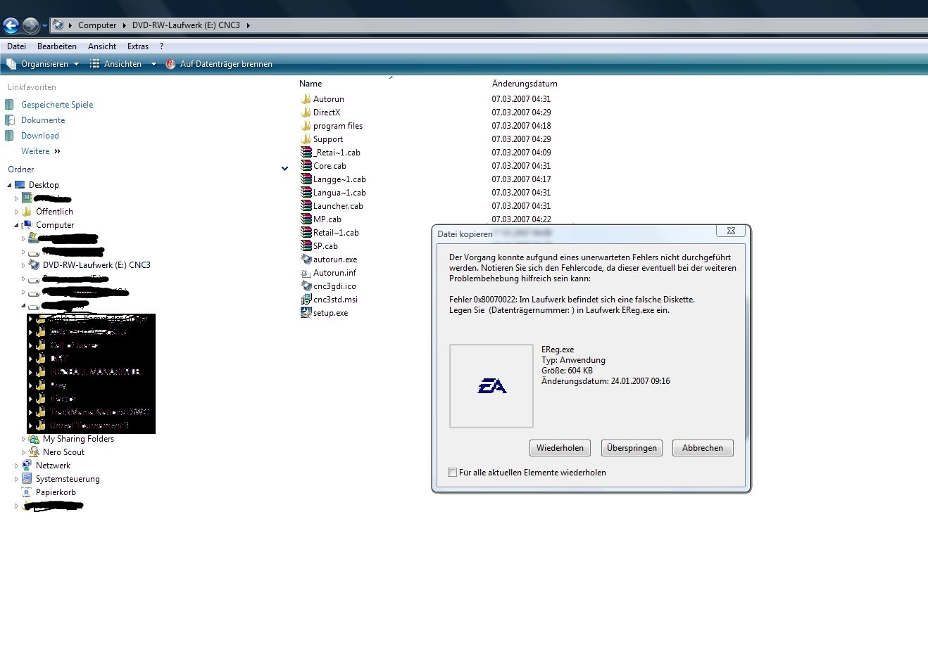 Hab seit gestern seltsame Probleme, wenn ich etwas von DVD installieren oder kopieren will. Beispiel C&C3: Die Installation beginnt und ab einem beliebigen Punkt (habs mehrmals probier zu installieren, jedes mal ne andere stelle) fängt das laufwerk an zu stottern und die Installation geht nicht weiter. Jetzt habe ich probiert den Inhalt der DVD auf die Festplatte zu ziehen und kriege eine Fehlermeldung. Hatte vermutet, dass vielleicht ein Kabel nicht ganz fest war, aber da lag nich der fehler.