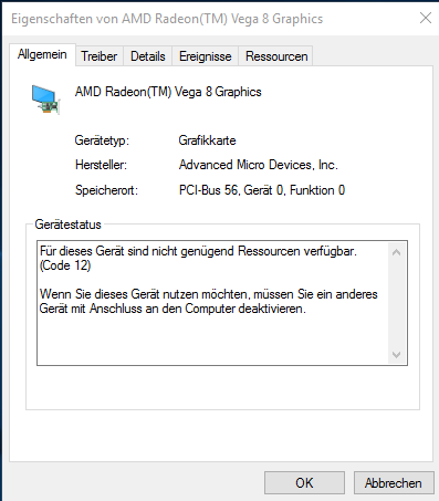 Ich habe dann überall nach Infos gesucht wenn ich in den Gerätemanager wird mir "Für dieses Gerät sind nicht genügend Ressourcen verfügbar. (Code 12)" Angezeit ich weiß einfach nicht was ich tun soll