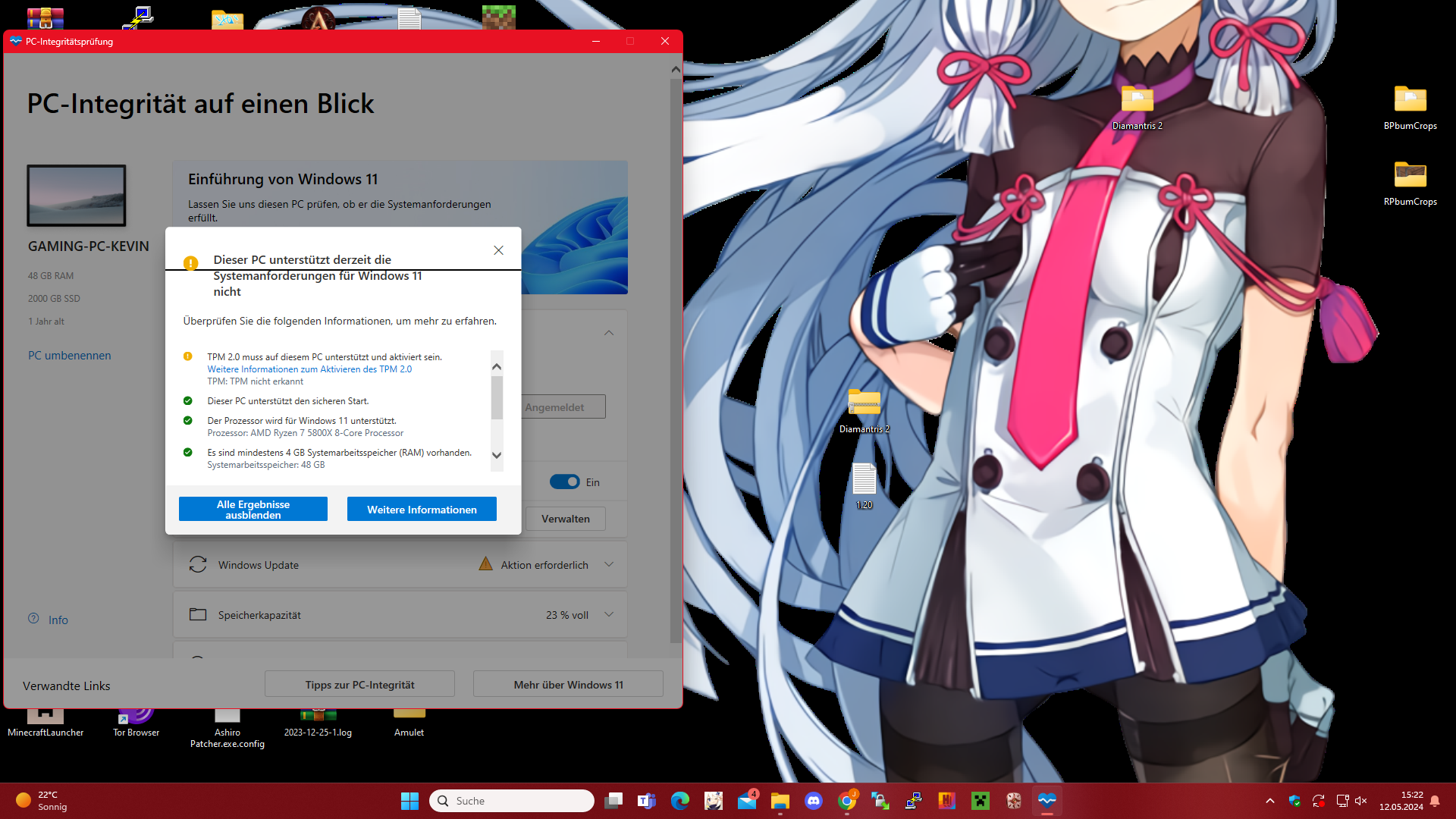 undzwar wenn ich die tpm aktivieren will wie sonst auch üblicherweiße kommt da aber diesmal kein text mit einer warnung sondern es ist einfach nur leer ich weiß nicht wieso das ist. Ich habe einen AMD Ryzen 7 5800x prozessor und windows11 und im Healtcheck wird angedeutet das tpm nicht erkannt wird was aber nicht sein kann ehrlich gesagt weiß ich nicht mehr weiter da dieser prozessor tpm2.0 normalerweiße unterstützt! Ich hoffe es kann jemand helfen da ich diesen fehler nicht kenne