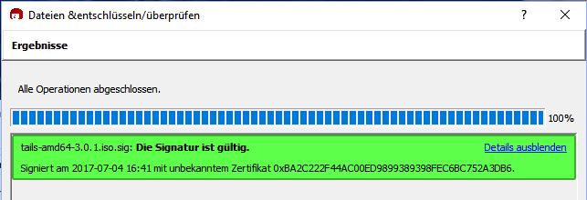 Es geht um die Prüfung eines iso-images mit einer Datei "Tails 3.0.1 OpenPGP signature", wo es dann heißt, ungenügende Informationen bezüglich des Zertifikats "Tails signing key" von der Seite: