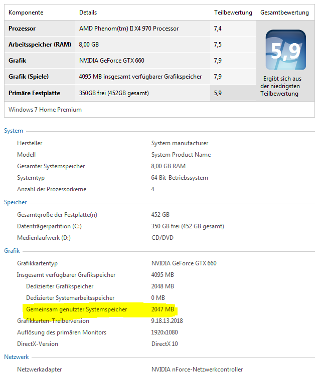 Grafik (Spiele) 4095 MB insgesamt verfügbarer Grafikspeicher 7,8
