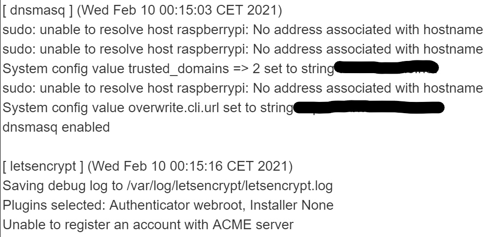 Hallo zusammen, ich versuche derzeit meinen Raspberry Pi zu einem Fileserver umzubauen. Jetzt bekomme ich bei der Konfiguration von Nextcloudpi den Fehler "Unable to register an Account with ACME-Server", wenn ich versuche NextcloudPi mit FreeDNS oder No-IP zu "verbinden". Ich greife derzeit per SSH auf meinen Raspberry zu. Die Fehlermeldung vom Webinterface habe ich in den Anhang eingefügt.