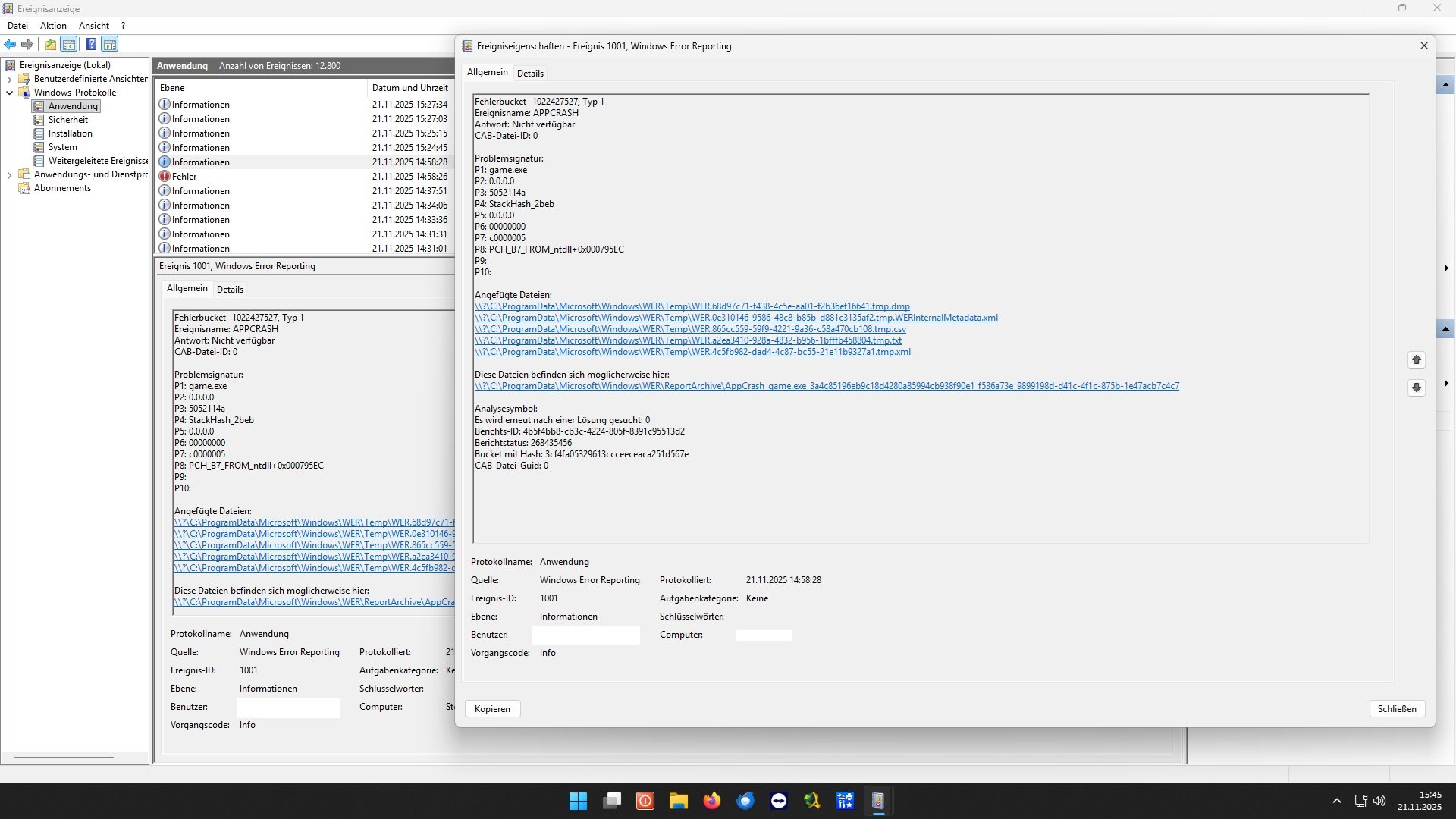 @inge70 ing a Den Fehler kann ich benennen. Da wollte ich mit der Installationsdstei versuchen zu reparieren aber der installer hat immer einfach geschlossen. Ich mache erstmal die Sachen was gescannt werden soll dan poste ich. Ich spiele das spiel am samstag dann nochmal und poste den Eintrag nochmal