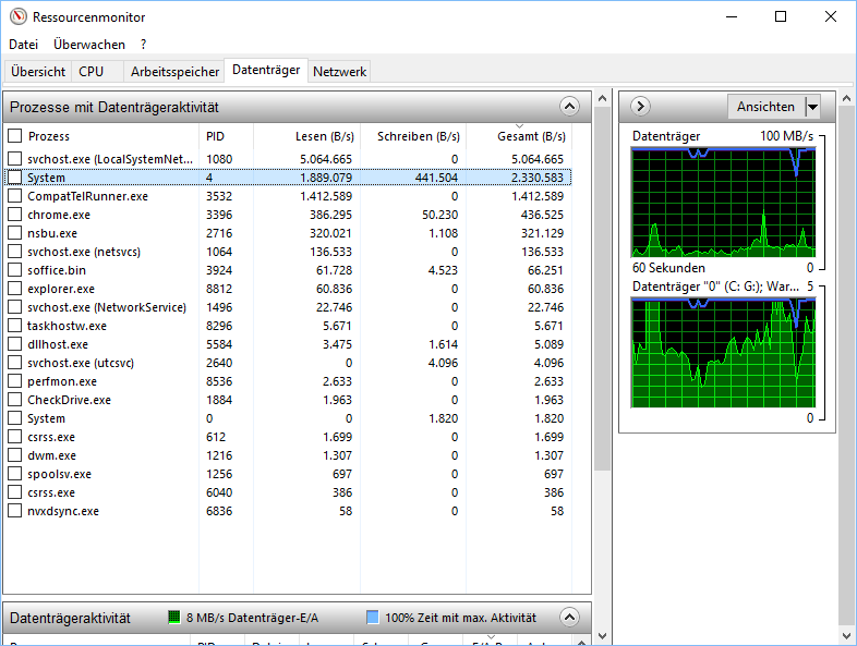 Seit Februar ist mir nun aufgefallen dass der PC ohne Vorwarnung und ohne Bluescreen sich einfach aufhängt. Er reagiert dann auf nichts mehr sodass ich ihn manuell neustarten muss. Diese Abstürze kamen in komplett unterschiedlichen Abständen. Teilweise hatte ich zwei Wochen Ruhe und dann stürzt er an zwei Tagen hintereinander jeweils einmal ab. Ich habe alle Treiber aktuell. Im Taskmanager ist mir dann aufgefallen, dass bei Datenträger, also bei der Festplatte manchmal 100% Auslastung ist obwohl ich nichts laufen habe. Dabei macht "System" fast die kompletten 100% aus. Ich dachte, dass vielleicht ein Defekt der Festplatte vorliegt, jedoch habe ich mehrere verschiedene Festplattenüberprüfungsprogramme (z.B. CrytalDiskInfo; HDTune) durchlaufen lassen und mir wird kein Fehler angezeigt. Gleiches gilt übrigens für Grafikkarte und Prozessor. Hat irgendjemand eine Idee woran es liegen könnte?