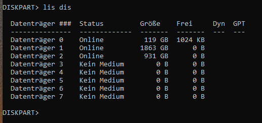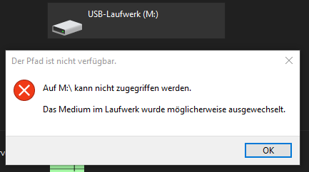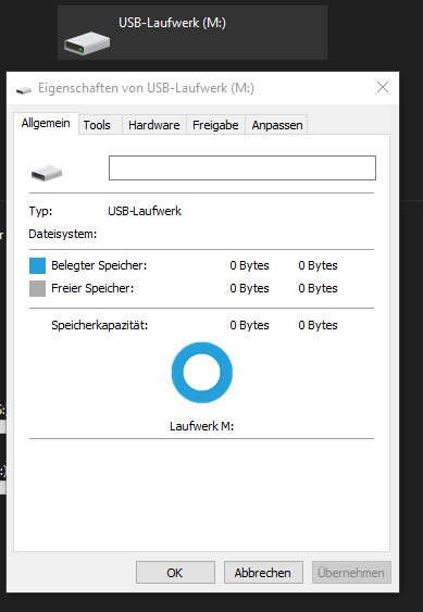 Unter Windows wird er im Explorer und in der Datenträgerverwaltung als Laufwerk M:\ angezeigt, das Laufwerk kann aber nicht geöffnet werden. Von den Daten die darauf sind gibt es ein Backup, sie sind also nicht wichtig.