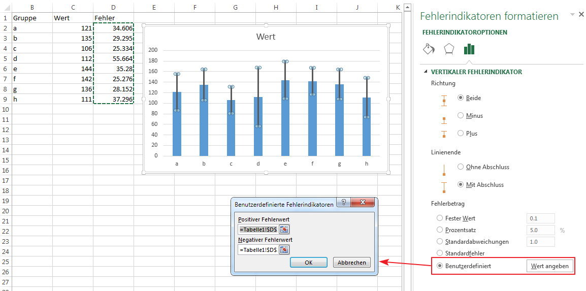 Wenn das Blockdiagramm erzeugt wird, geh ich auf den Reiter "Layout" (wenn das Diagramm angewählt ist, unter Diagrammtools). Dort gibt es bei mir dann einen Bereich, um die Indikatoren auszuwählen. Dort gehe ich auf "weitere". Excel fragt mich dann nach der Datenreihe, die für die Fehler ausgewählt werden soll. Dort wähle ich dann bspw. Datenreihe 2 aus. Es öffnet sich ein Fenster "Fehlerindikatoren formatieren", wo ich dann den Fehlerbetrag auf "Benutzerdefiniert" setze und bei "Wert angeben" den entsprechenden Spaltenbereich für positiv und negativ mit den abs. Fehlern auswähle. Da müssted man wahrscheinlich noch eine Division durch 2 einfügen, je nachdem, wie der Fehler liegen soll.