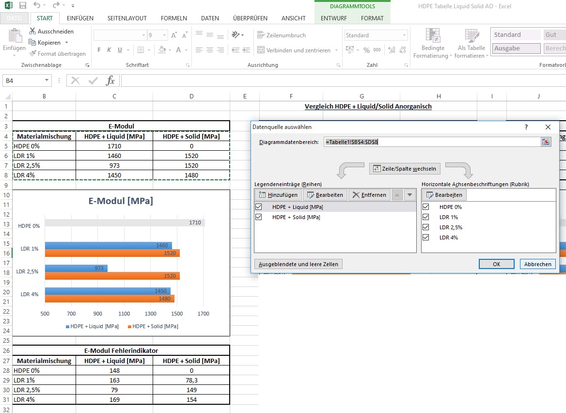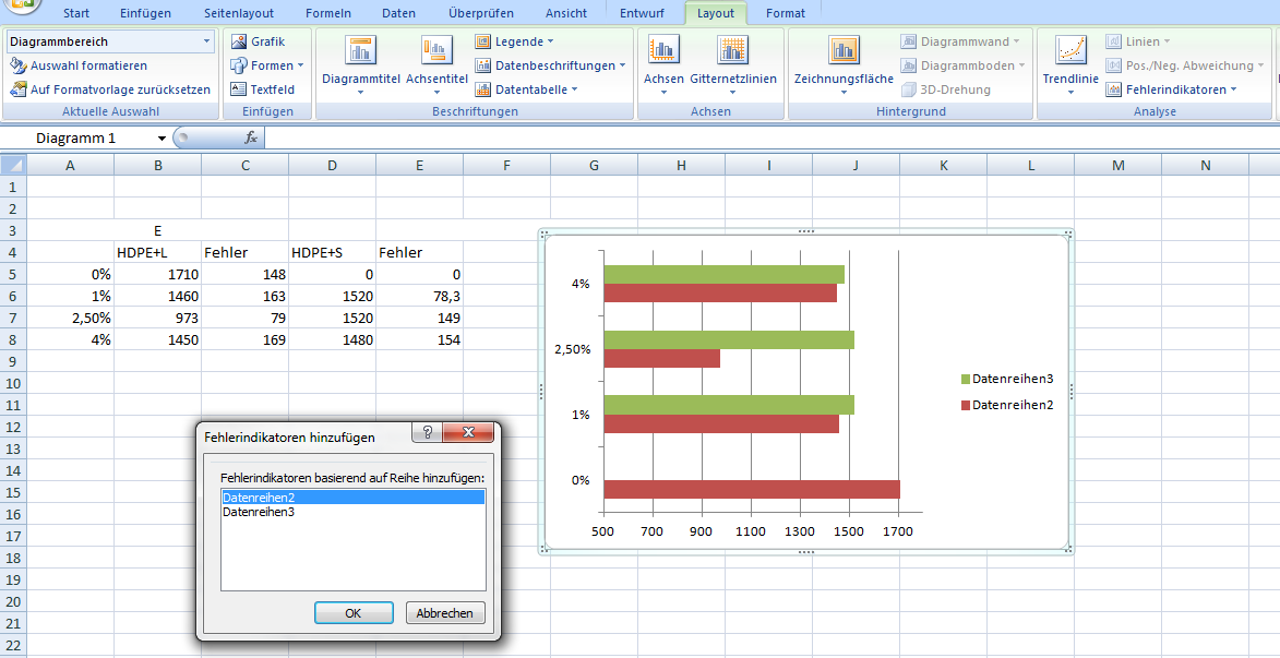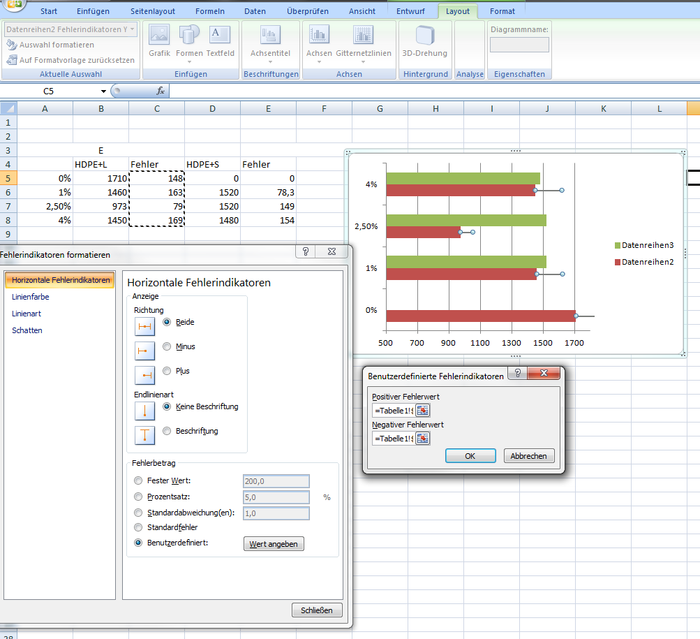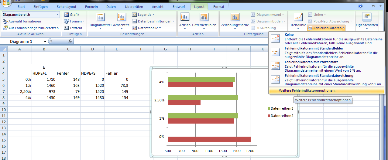Wenn ich dann noch Indikatoren für die grünen Balken haben will, mach ich das ganze Prozedere nochmal, nur dass ich beim Einfügen diesmal nicht Datenreihe 2, sondern Datenreihe 3 für die Indikatoren auswähle und als Fehlerwerte natürlich die andere Fehlerspalte verwende.