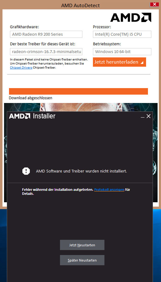 Ich bekomme immer wieder bei der AMD-Grafiktreiber-Installation eine Fehlermeldung (siehe Anhang)
