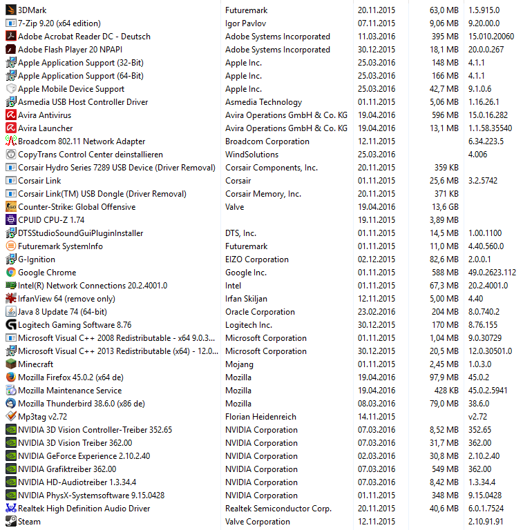 bekomme seid dem Rollout von obigen Update immer nach dem Neustart die Fehlermeldung *Fehler 0x800736b3*. Laut MS (Telefonsupport) ist der Avira Virenschutz (free) daran Schuld, angeblich ein internes Tune up Tool. Bis zu diesem KB lief alles ohne Probleme. Es ist kein TuneUp Tool, wie CCleaner,etc. installiert. Mein Computer ist ein Selbstbau mit folgenden Komponenten: ASUS Z170 DeLuxe, Intel i7 6700k, G.Skill RipJaws 4 blau DDR4-2400 32Gb, Palit GeForce GTX 980 Super Jetstream Aktiv 4Gb, 500GB Samsung 850 Evo, 850 Watt Corsair RM Series Modular 80+ Gold und Corsair Hydro Series H110i GT. Installierte Software und Fehlermeldung im Anhang. Laut MS soll mir nur eine Neuinstallation von Win 10 helfen.