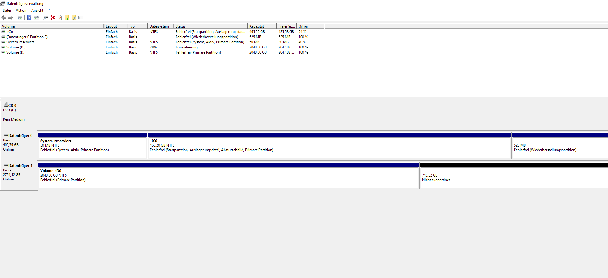 Als ich dann eine neue Partition erstellt habe, wurde der Volumen quasi "gesplittet". Ich kann aus der HDD jetzt eine 2TB Partition herausholen, an die restlichen 750GB hingegen komme ich nicht mehr ran. Volumen erweitern funktioniert auch nicht.