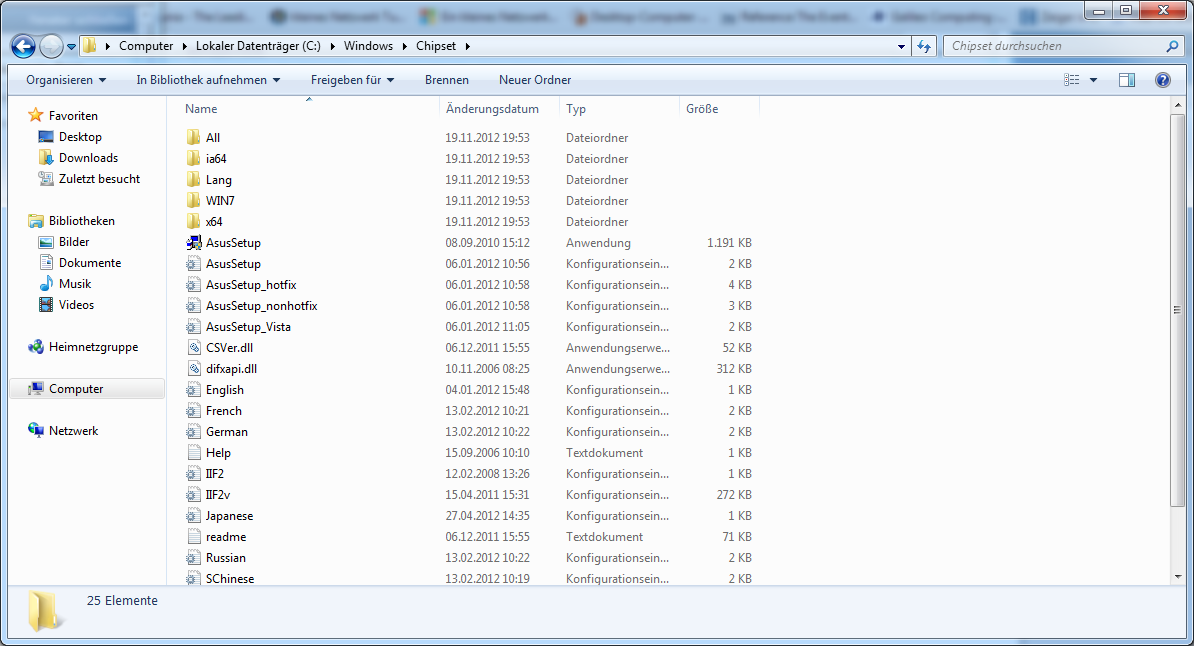 Testweise habe ich auch mal im Ordner Hotfix (im gedownloadeten Ordner des Chipsatztreibers mit den verschiedenen Unterordern) die ASUS Setup ausgeführt, worauf er auch Treiber installierte (wobei ich nicht weiß welche). Bei den restlichen ASUS Setup.exe-Dateien hieß es, dass mein BS nicht unterstützt würde.