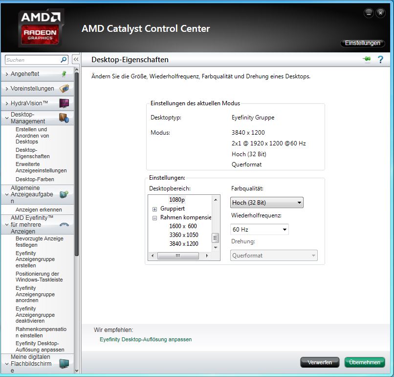 Eingestellt sind beide auf die Auflösung 1920 x 1200. Ich mache den Monitor einfach aus und wieder an und dann ist alles wieder gut. Aber das kann es auf Dauer ja nicht sein.