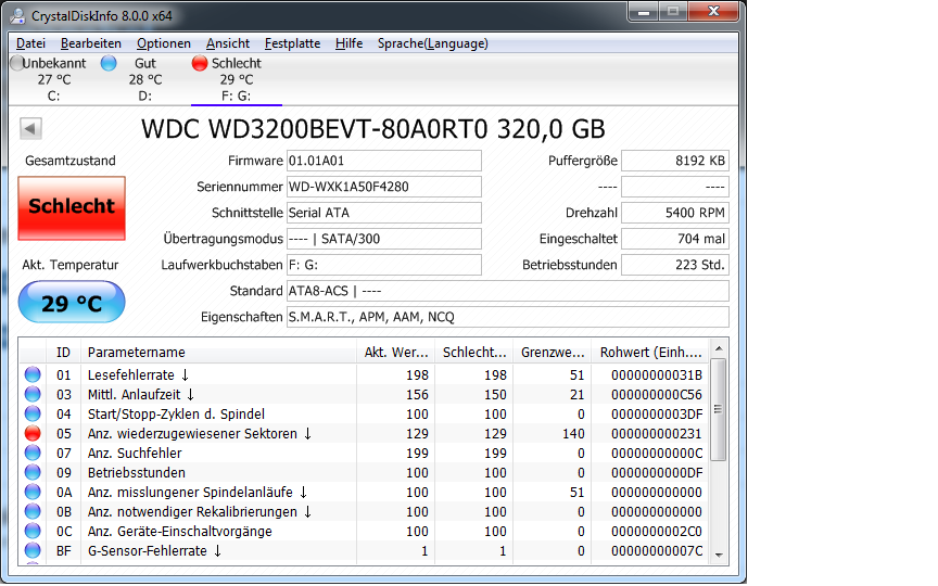 Pass übrigens mit der neuen HDD besser auf, die alten hatte einige Auslösungen des G-Sensors, also zu harte Stöße erlebt während sie lief (die anderen werden ja nicht aufgezeichnet). HDD sind empfindlich! Von HGST gibt es dieses Video über die Empfindlichkeit und korrekt Handhabung von HDDs, mit dem Empfehlung wie die Umgebung aussehen sollte auf denen mit HDDs gearbeitet wird und sie weisen darauf hin, dass die Schäden sich auch erst später bemerkbar machen können.
