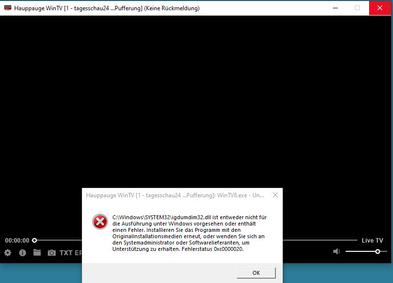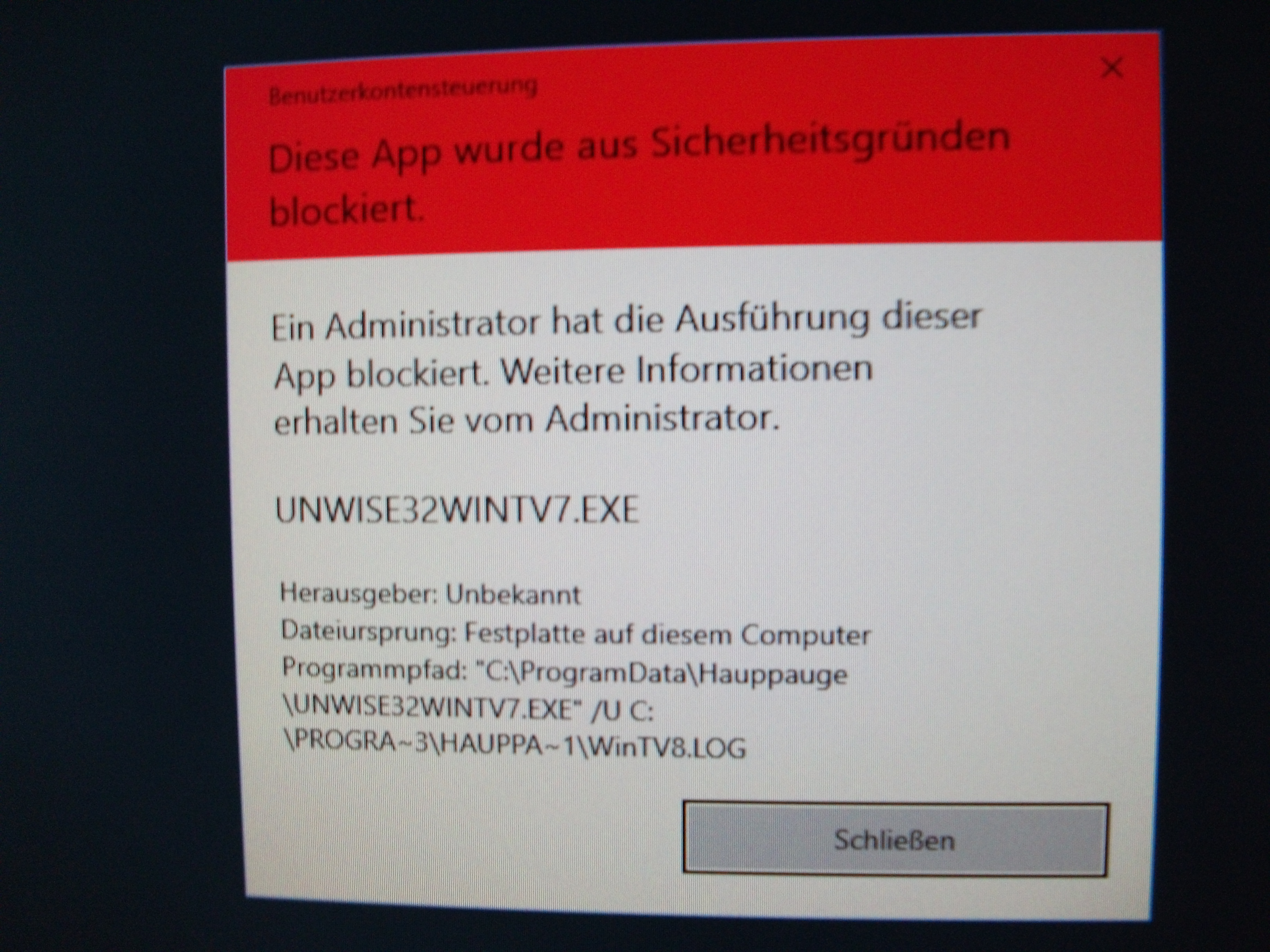 Nach der Umstellung auf Windows 10 kommt beim ersten Start von WinTv unter Windows 10 der Fehler (siehe Screenshot in der Dateianlage: