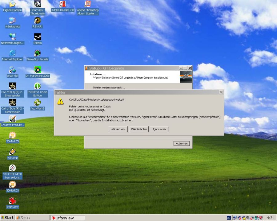 jedes mal wenn ich eine anwendung bsp viele spiele installieren will, bekomme ich die meldung die datei sei beschädigt und nicht verwendbar,obwohl die discs sind alle in ordnung!hat das vielleicht was mit den service pack 2 zu tun?? bitte helft mir bin am verzweifeln