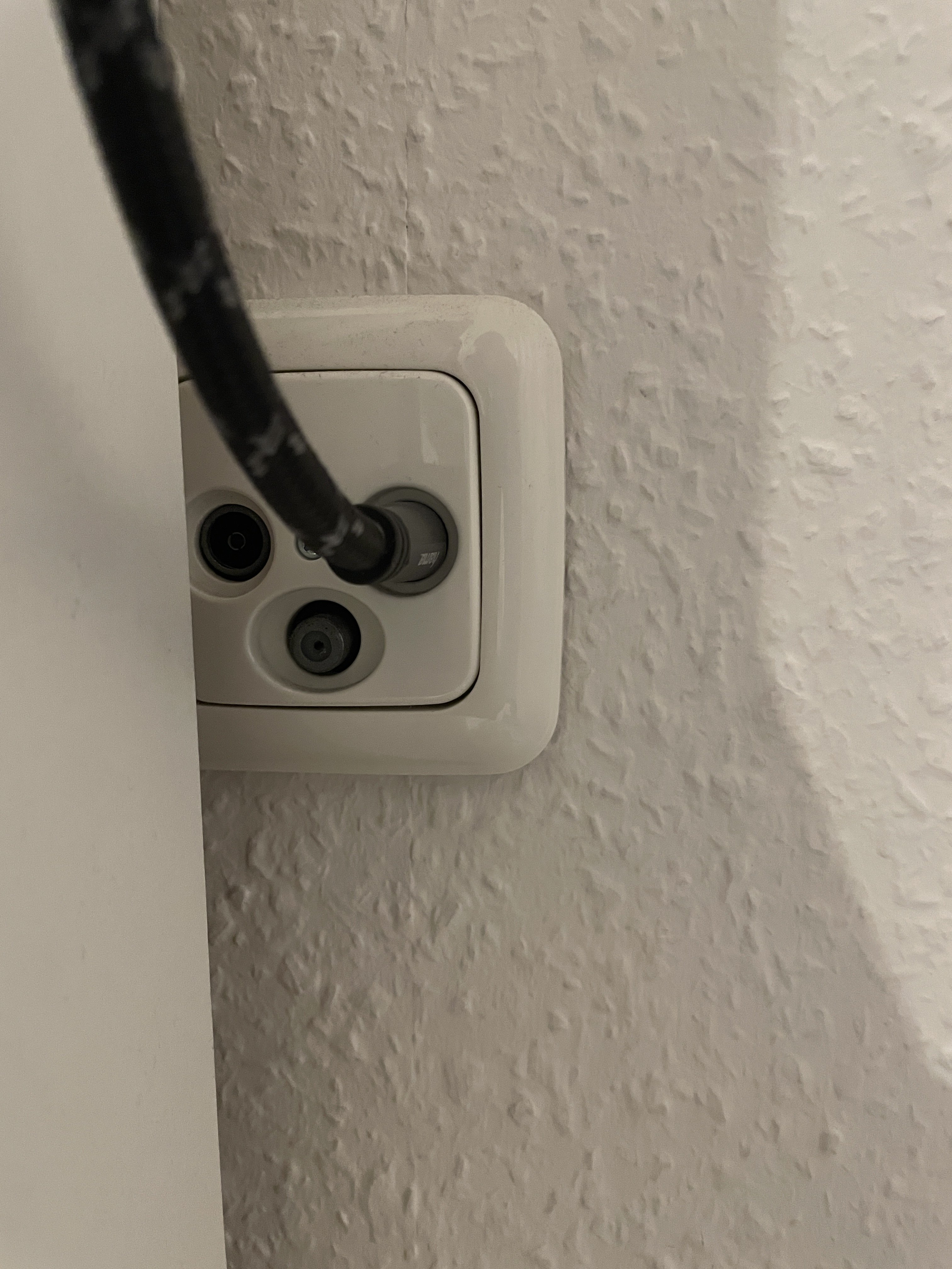 Da wo der Kabel hinführt ist der Anschluss für Antenne, die anderen beiden sind für SAT Fernsehen und Kabel-Fernsehen. Und eben beide kann ich nicht nutzen, da ich dort keine Sender reinkriegen kann und auch m+w vertauscht ist. Also geht es nur über Antenne, siehe die ersten Fotos :-)Dipol schrieb:Ohne Fotos der Dose oder der Kopfstelle