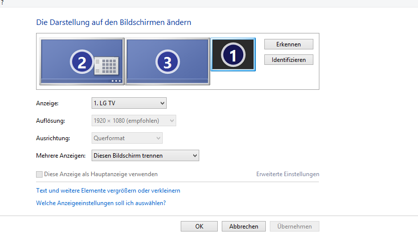 Habe versucht bei Bildschirmauflösung -> Fernseher -> Mehrere Anzeigen -> Desktop auf diese Anzeige erweitern