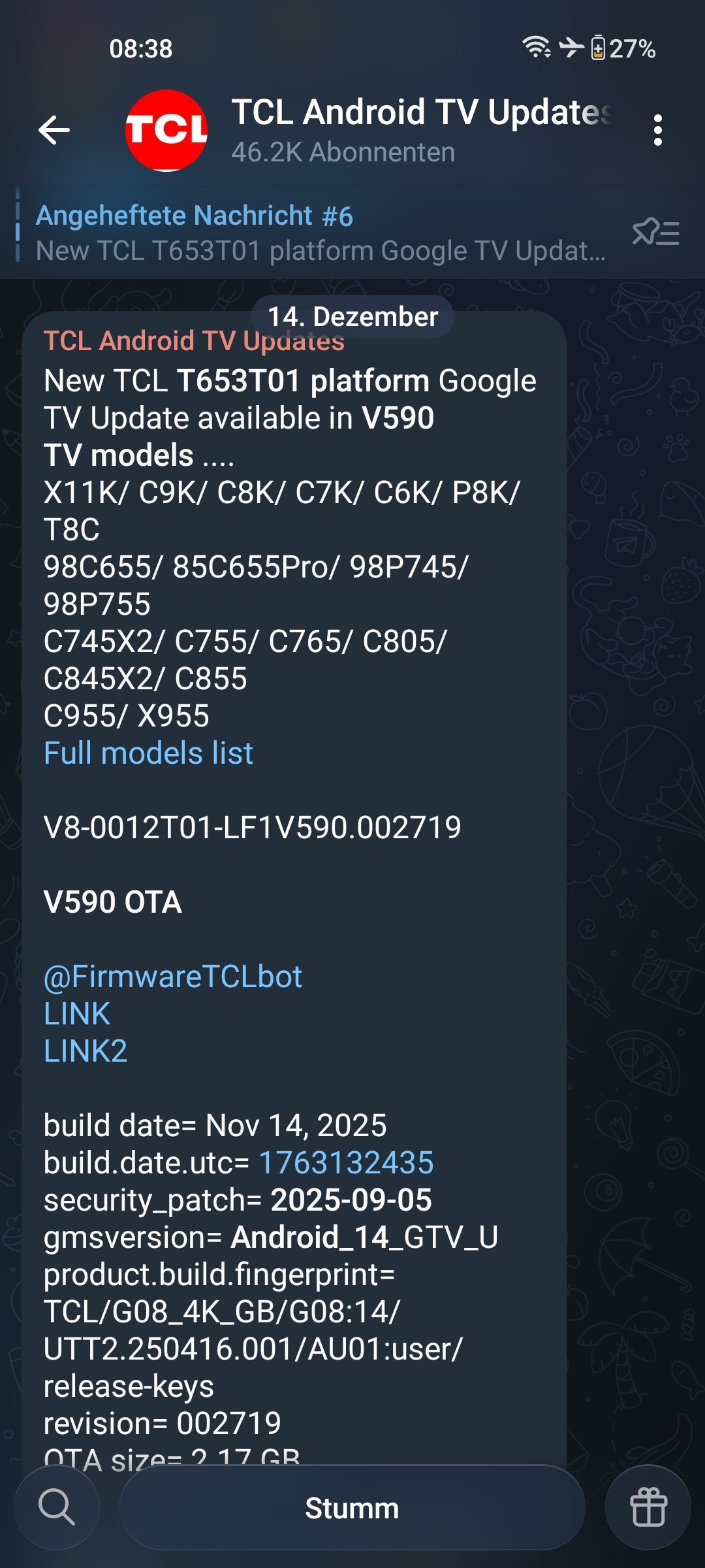 Bei meinem qm8b (c755) mit Deutschland als Standort hat noch kein einziges OTA bekommen. Laut diversen Quellen wird Frankreich und Großbritannien bevorzugt aber auch das kurzzeitige umstellen brachte nichts.onetwoxx schrieb:Bei den neustens Firmwares v560 und v590 wurde das Motionhandling stark verbessert, entweder manuell updaten oder warten bis TCL per OTA die Fimwares ausrollt,