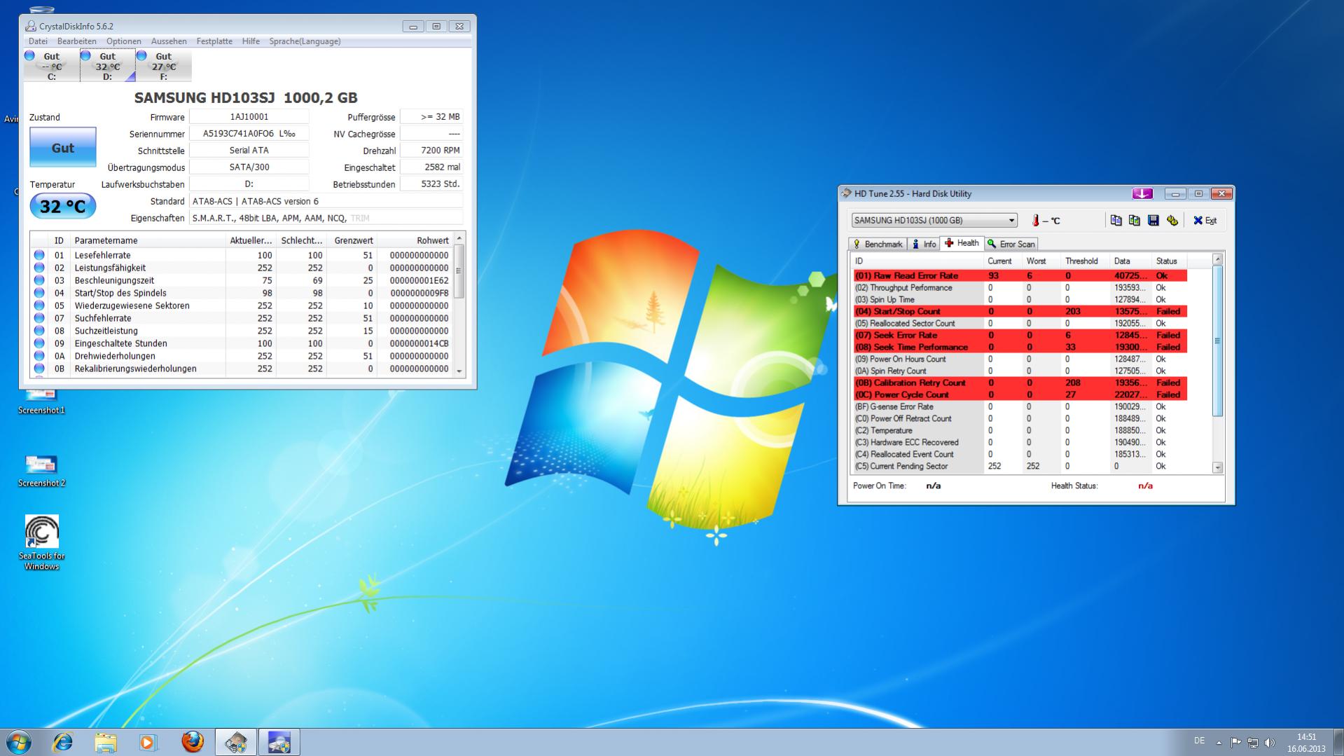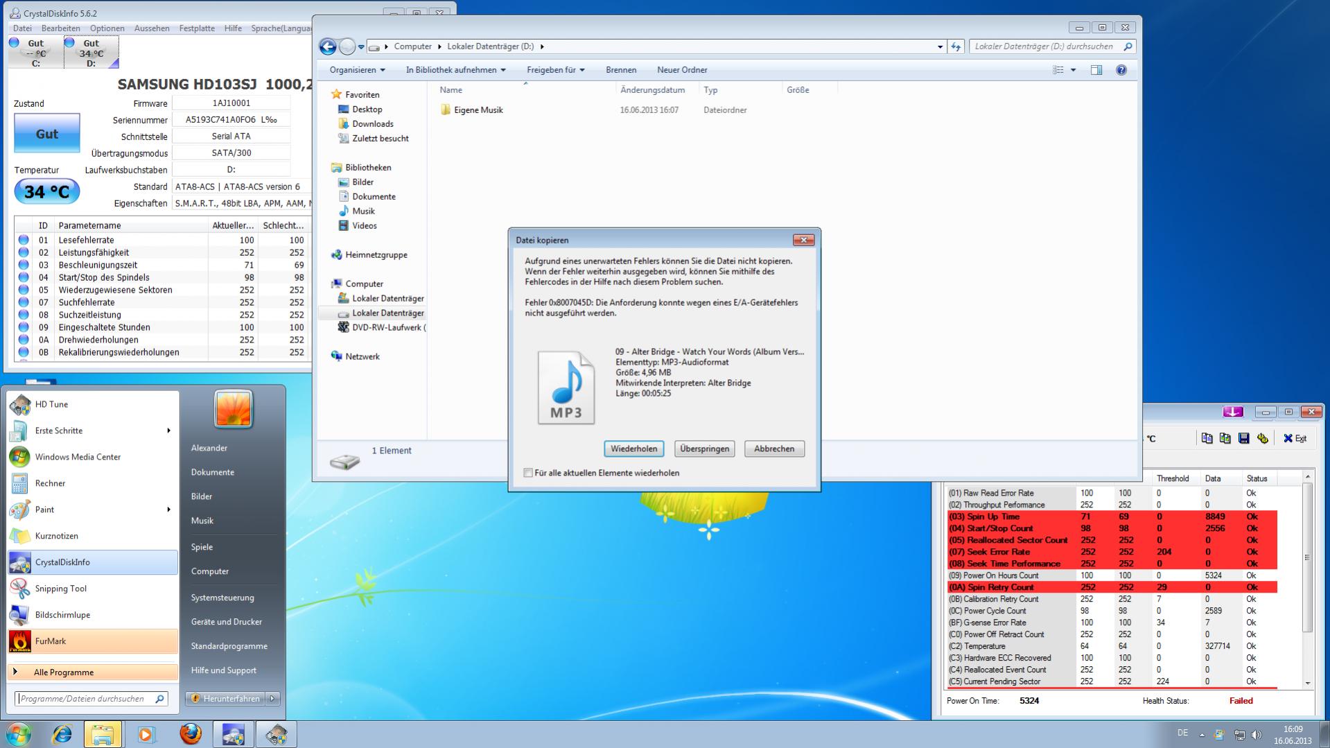 Die HDD wurde daraufhin angezeigt, konnte aber erst nach sehr viele Versuchen eingerichtet werden. Wurde sie dann aber beschrieben, so blieb der Vorgang hängen und die HDD verschwand wieder aus der Ansicht. Die angefügten Screenshots zeigen die Fehlermeldungen von HD Tune während eines solchen Abbruchs. Nun liegt natürlich nahe, dass die Platte einfach defekt ist (SATA- und Stromkabel wurden alle getestet und getauscht). Wenn ich sie aber per Adapter über USB anschließe, sowohl auf meinem, als auch auf einem anderen PC, so funktioniert sie ohne Probleme. Also habe ich sie bei meinem Kumpel in den Rechner eingebaut. Ergebnis: Die Platte funktioniert auch dort ohne Probleme.