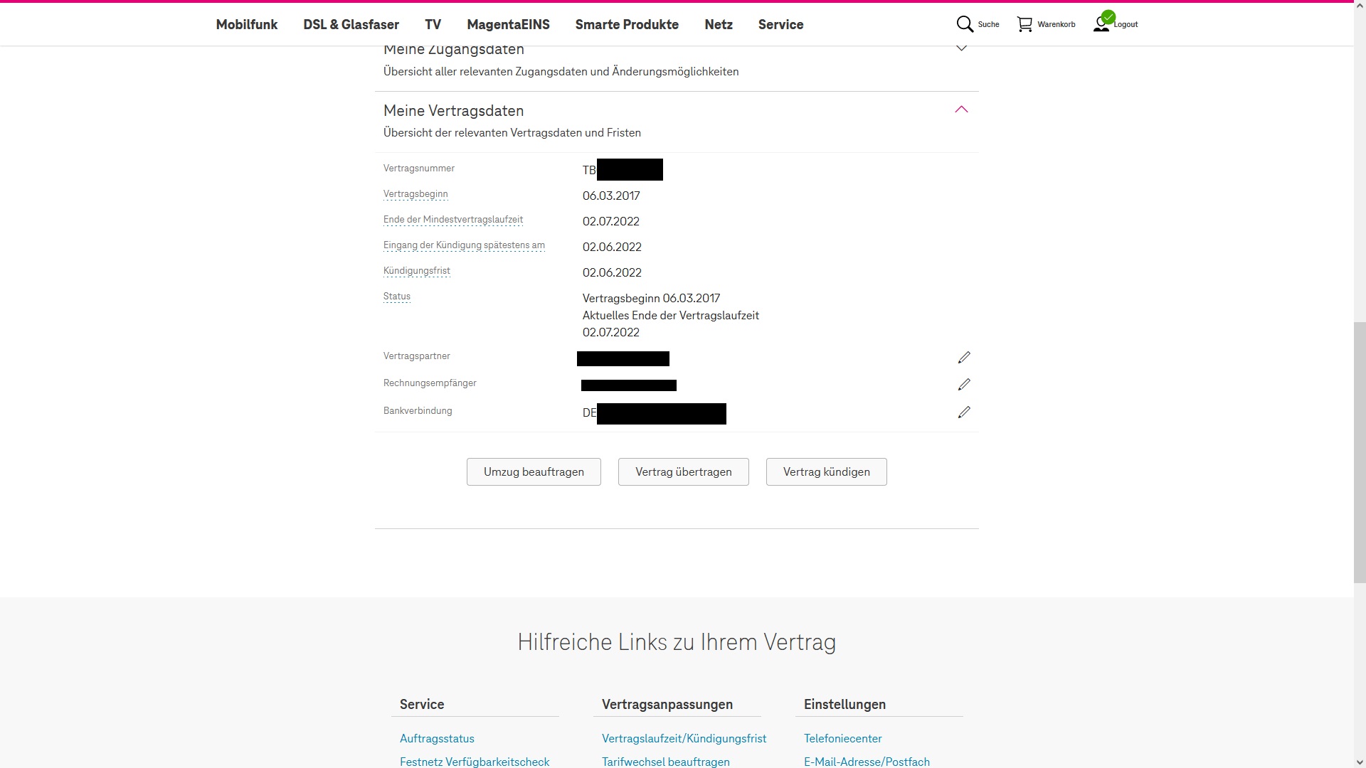 Haus mit zwei Wohneinheiten. Unten meine Eltern, oben wohne ich. Telekom 50/10 MBit/s Magenta Zuhause Hybrid. Erhalte nicht die vollen 50 MBit/s da meine Leitung zu lang ist. Sind aber immer noch ~40 MBit/s. Wenn es gut läuft, kommen per LTE nochmal ~30 MBit/s dazu. Vertrag besteht seit März 2017. Kündigungsfrist ist ja ein Monat vorher. Laufzeitverlängerung 12 Monate. Anschlussinhaber ist mein Vater.