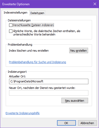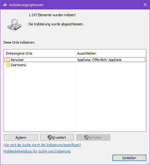 unter Windows10\Systemsteuerung\Indizierungsoptionen steht: 347 Elemente wurden indiziert und: Die Indizierung wurde abgeschlossen. Im Feld Einbezogene Orte und Ausschließen steht nichts.