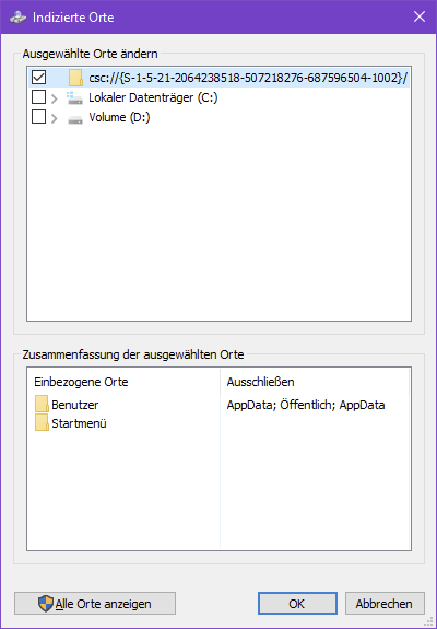 Wenn ich nun die Partition C: zum Indizieren wähle, erscheint die Partition D: im Feld Zusammenfassung der ausgewählten Orte. Was bitte muss ich tun, damit anstelle der Partition D: die Partition C: zum Indizieren erscheint?
