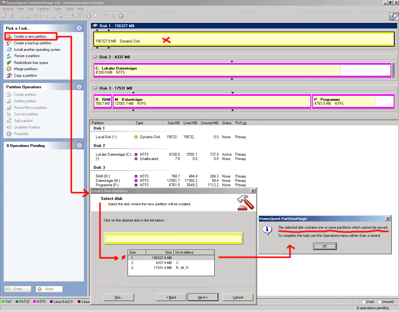 Markiere jeweils nacheinander die zweite und dritte Partition, und setze die mit dem Links oder Rechtspfeil auf der Tastatur auf D für gelöscht!