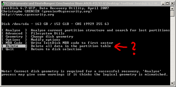 Beende Testdisk und starte den Computer neu.Im Fall wenn bei dir ein Bootsektor defekt sein sollte, kann dort noch ein Menü Boot erscheinen.
