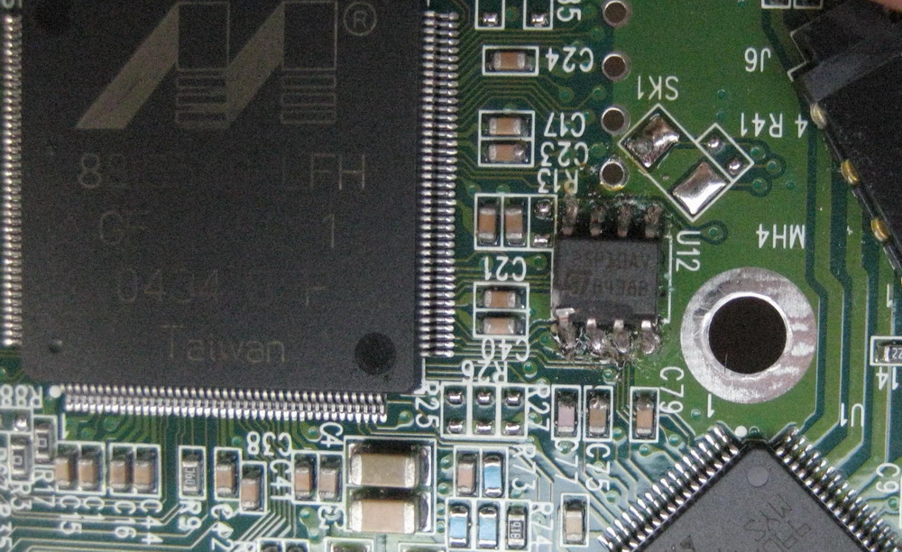 U12 hat bei mir folgende Aufschrift: 25P10AV ST B438B, sollte also der Flash-Baustein sein.