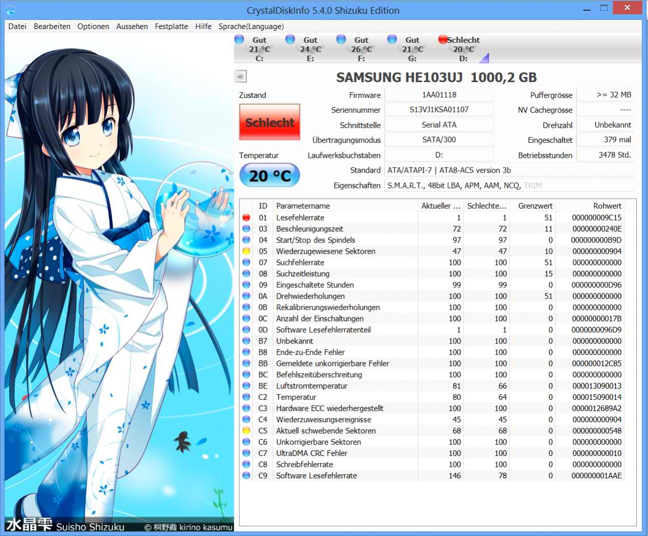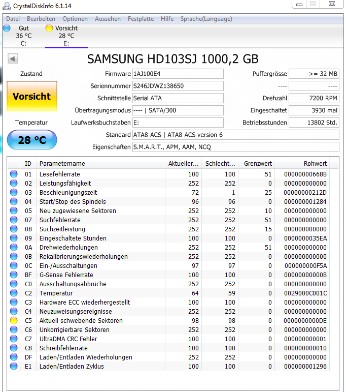 Hab mal CrystalDiskInfo installiert. Kann mir da mal wer was zu sagen, der sich damit auskennt? Gibt es weitere Tools, mit denen ich die Platte irgendwie noch retten kann?