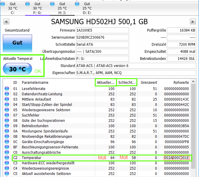 Holt schrieb:Das ist kein Müll, sind da stehen die Extremwerte drin, die 0x2A = 42 sind die höchste Betriebstemperatur und die findet sind in der Form 100-42 = 58 auch als schlechtester Wert wieder. 0x0C = 12 war die niedrigste Temperatur die je im Betrieb aufgezeichnet wurde.