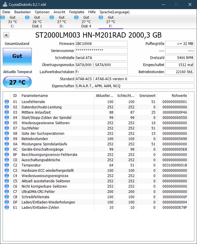Nein, die sind nicht großartig besser oder schlechter als die HDDs anderer Hersteller. Hier hat auch schon der G-Sensor 6 mal ausgelöst, also zu harte Stöße während des Betriebs erkennt. HDDs sind empfindlich! Von HGST gibt es dieses Video über die Empfindlichkeit und korrekt Handhabung von HDDs, mit dem Empfehlung wie die Umgebung aussehen sollte auf denen mit HDDs gearbeitet wird und sie weisen darauf hin, dass die Schäden sich auch erst später bemerkbar machen können.Akkulaus schrieb:Sind die Seagate Festplatten wirklich so schlimm?