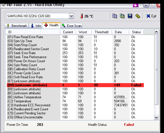 Auf ihr läuft XP Home SP3. Ich musste aber in letzter zeit windows so alle 3Wochen neu installieren, da Colin MCRae Dirt und andere Programme fehler bekommen hatten, ich dachte es liegt an dirt. aber seit freitag habe ich neue probleme, ohne dass dirt drauf ist! Plötzlich brauchen autostart programme, wie AVM-Wlan, Anitvir, CCC und traytools 3Minuten zum laden, wärend dessen, kann ich nichts machen! ich habe auch schon antivir drüber laufen lassen-nichts und hd tune, der findet auch nichts. Aber beim health status zeigt es mir einen fehler an: ID: (B8) (unknown attribute) | Current: 1 | Worst: 1 | Thershold: 99 | Data: 149 | Status FAILED