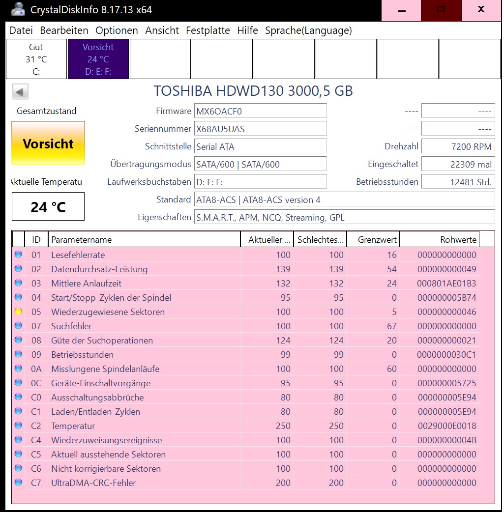 Festplatte entsorgen, Crystal Disk INFO zeigt Vorsicht an