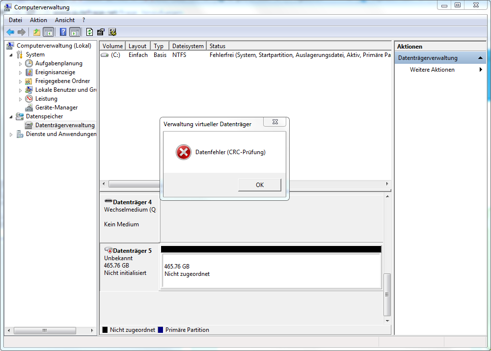 Wenn ich die Festplatte in ein externes Gehäuse gebe und in die Datenträgerveraltung gehe, und dort die Platte initalisieren möchte (egal ob MBR oder GPT) bekomme ich immer die Meldung CRC-Prüfung (siehe Anhang).