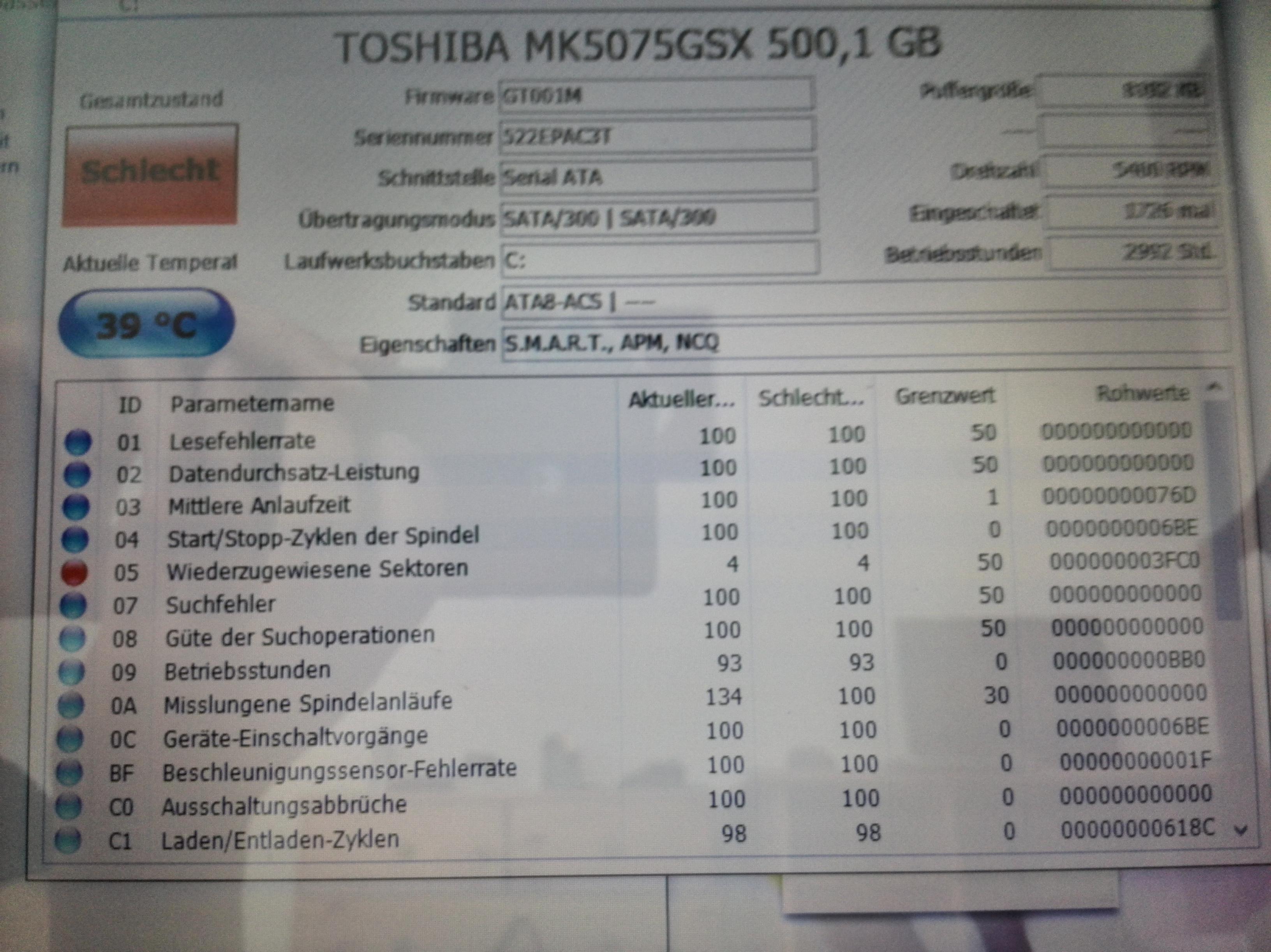 Hallo, ich habe einen 4 jahre alten Toschiba L850-167 Laptop. Seit gestern Abend wird mir angezeigt, dass die Festplatte fehlerhafte Sektoren hat. Seit dem ist der Laptop sehr langsam. Er braucht mehrere Minuten um zu booten und Programme zu öffnen. Deshalb habe ich den Crystal Disk Info über die Festplatte laufen gelassen. Es stellte sich heraus dass ich 4 wiederzugewiesene Sektoren habe. Hat jemand eine Lösung für dieses Problem?