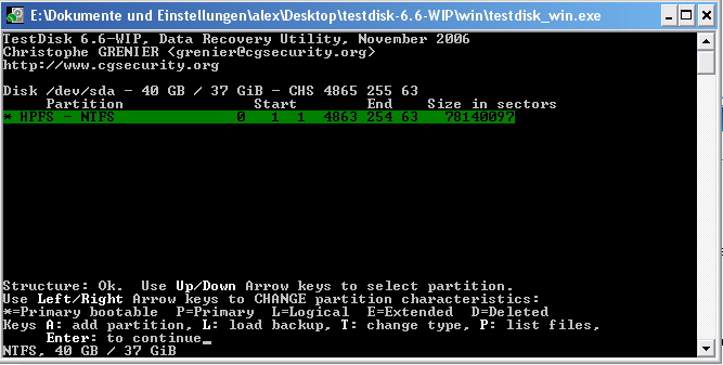 Starte Testdisk bestätige bei dem Log-Datei-Screen mit Enter, wähle deine betroffene Festplatte aus und bestätige mit Enter, bestätige bei Partition Table Typ