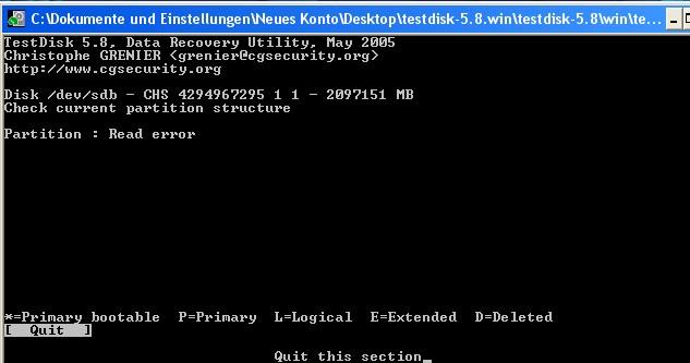 - Testdisk findet die Platte, gibt ihr Größe aber auf 2097151 MB (!) an, bei "Analyse" erscheint ein Read Error, die Tiefenanalyse würde vermutlich mehrere Tage dauern (bin bisher schon in mehreren Stunden noch nichtmal bis 1% gekommen)