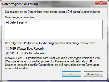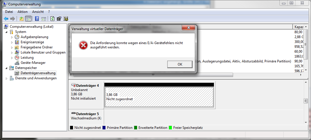Windows Datenträgerverwaltung -> Initialisierung der Festplatte schlägt fehl, falsche Größe.