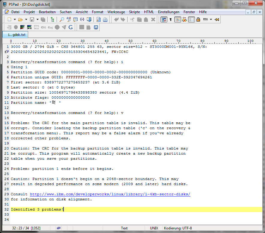 ich habe ein merkwürdiges Problem, viellicht hatte das schon jemand und kann mir weiterhelfen: Meine Seagate Barracuda mit 3 TB (ST3000DM001, Bau-/Kaufjahr 2013) wird seit einigen Tagen nicht mehr richtig erkannt. Im Bios wird sie gar nicht angezeigt, unter Windows 7 x64/Linux (Ubuntu 14.04) kann ich sie über die verschiedenen, systeminternen Tools finden. Dort wird sie jedoch mit unterschiedlichen Größen angezeigt, darauf zugreifen kann ich nicht wirklich.